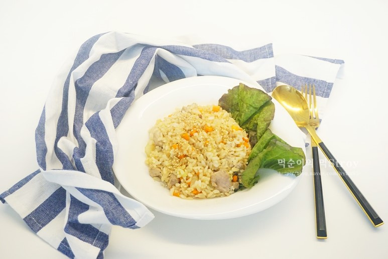 ¡Ahora es el momento de sazonar el arroz frito! Como consejo del Chef Baek Jong-won, empuje el arroz hacia un lado de la sartén, agregue 2 cucharadas de salsa de soja y déjela chisporrotear y caramelizar ligeramente antes de mezclarla. Esto realza el sabor de la salsa de soja. Luego, agregue 1 cucharada de mirin, una pizca de pimienta negra y una pizca de sal. Mezcle todo a fondo para sazonar. Esta cantidad debería estar suficientemente sazonada, pero si lo prefiere más salado, puede agregar un poco más de sal para un sabor limpio. ¡Finalmente, agregue 1 cucharada de aceite de sésamo para un acabado fragante, y su delicioso arroz frito de cerdo estará listo!