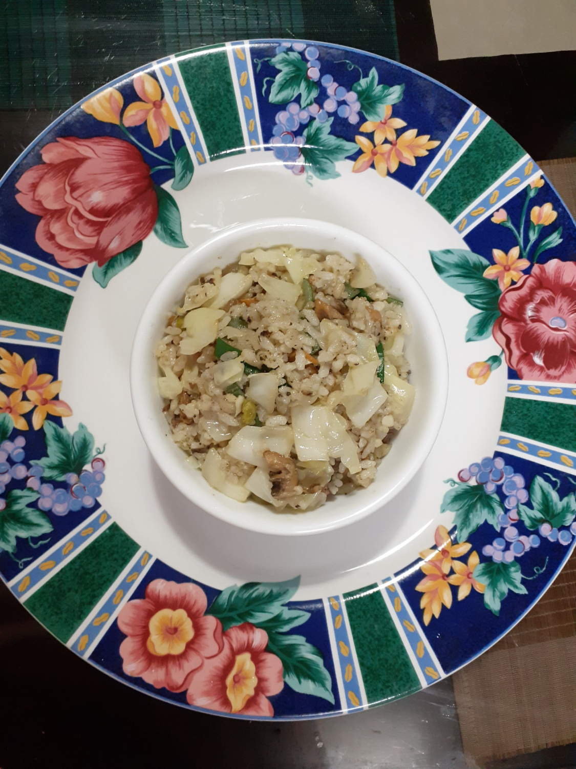 Primero, prepararemos las verduras para el arroz frito. Pica el repollo en cubos de aproximadamente 1 cm y pica finamente la cebolla. Preparar las verduras de esta manera asegura que se cocinen uniformemente y tengan una textura agradable.