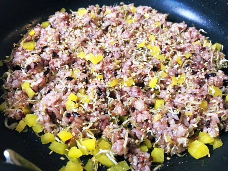 A continuación, añade 3 cucharadas de anchoas salteadas y mezcla bien con el arroz y las huevas. El sabor salado y umami de las anchoas impregnará todo el arroz frito.
