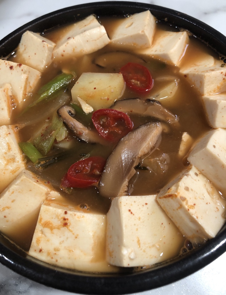 Este Doenjang Jjigae, preparado con un caldo de anchoas bien hecho, es un pilar de la cocina casera que cualquiera puede preparar fácilmente. Su caldo claro y profundo es excepcional y constituye una comida deliciosa que te hará terminar el arroz en un instante.