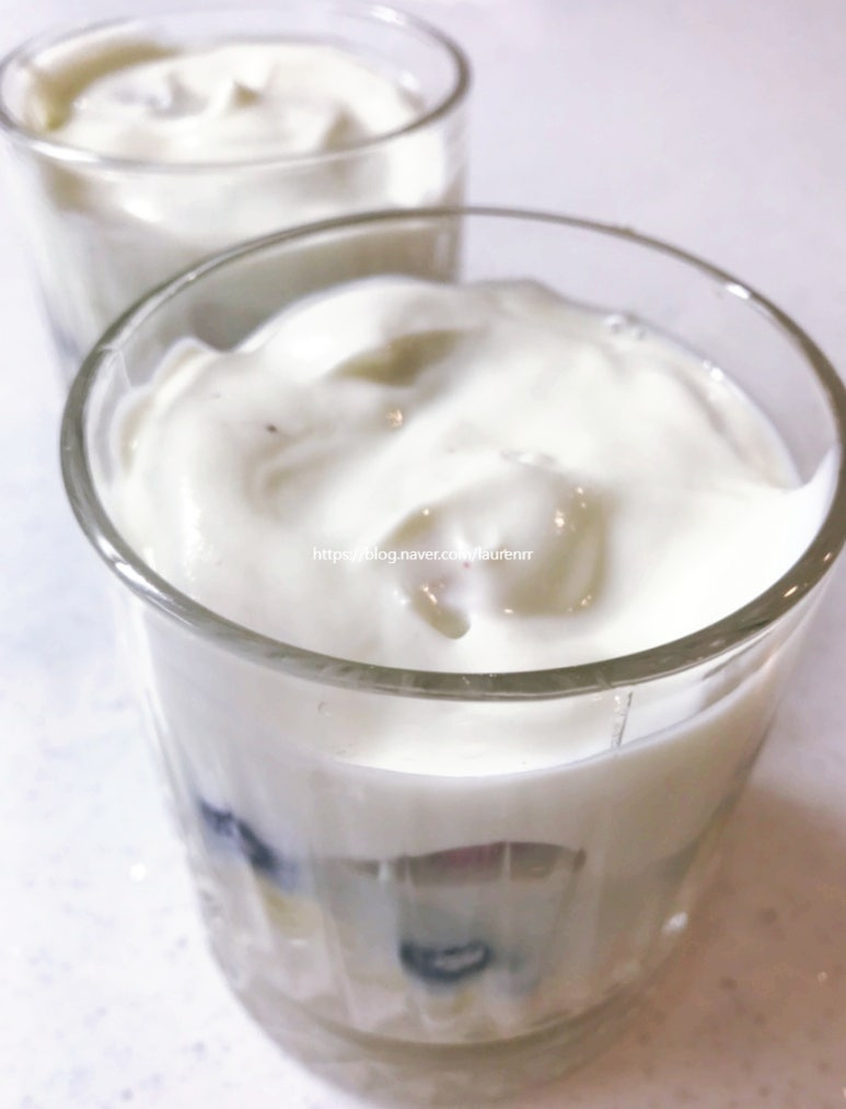Finalmente, añade 2 generosas cucharadas de yogur griego natural sobre la fruta. El yogur aporta una textura cremosa y riqueza.