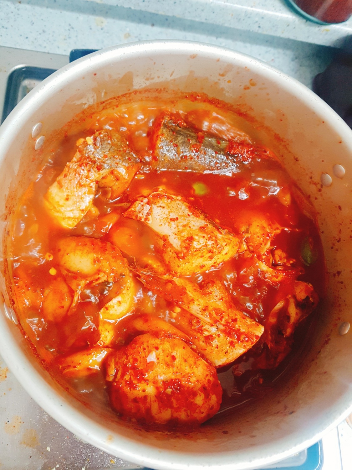 Coloca los filetes de bacalao descongelado en el fondo de tu olla. Unta generosamente la salsa de condimento preparada sobre el pescado. Coloca los chiles Cheongyang y la cebolleta en rodajas encima. Finalmente, vierte 1.5 tazas de agua.