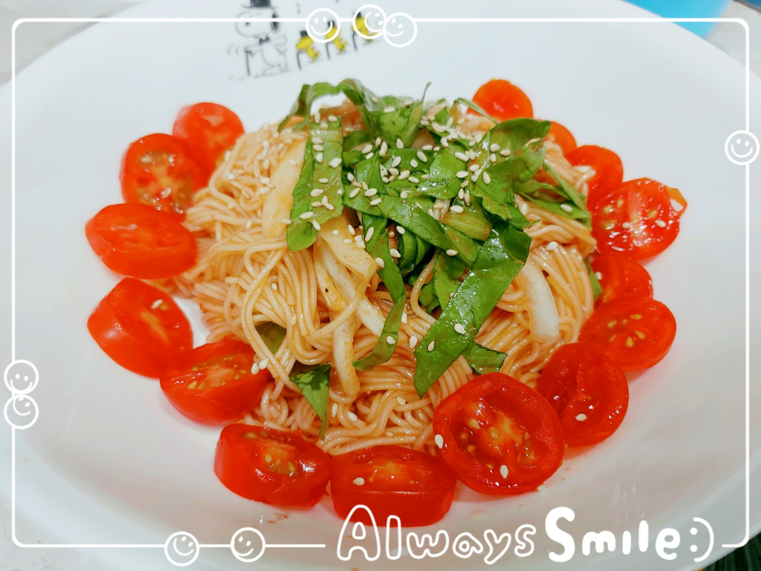Transfiera el bibim guksu bien mezclado a un bol para servir. Coloque artísticamente los tomates cherry cortados alrededor de los bordes. ¡Su delicioso y refrescante bibim guksu está ahora listo para ser disfrutado!