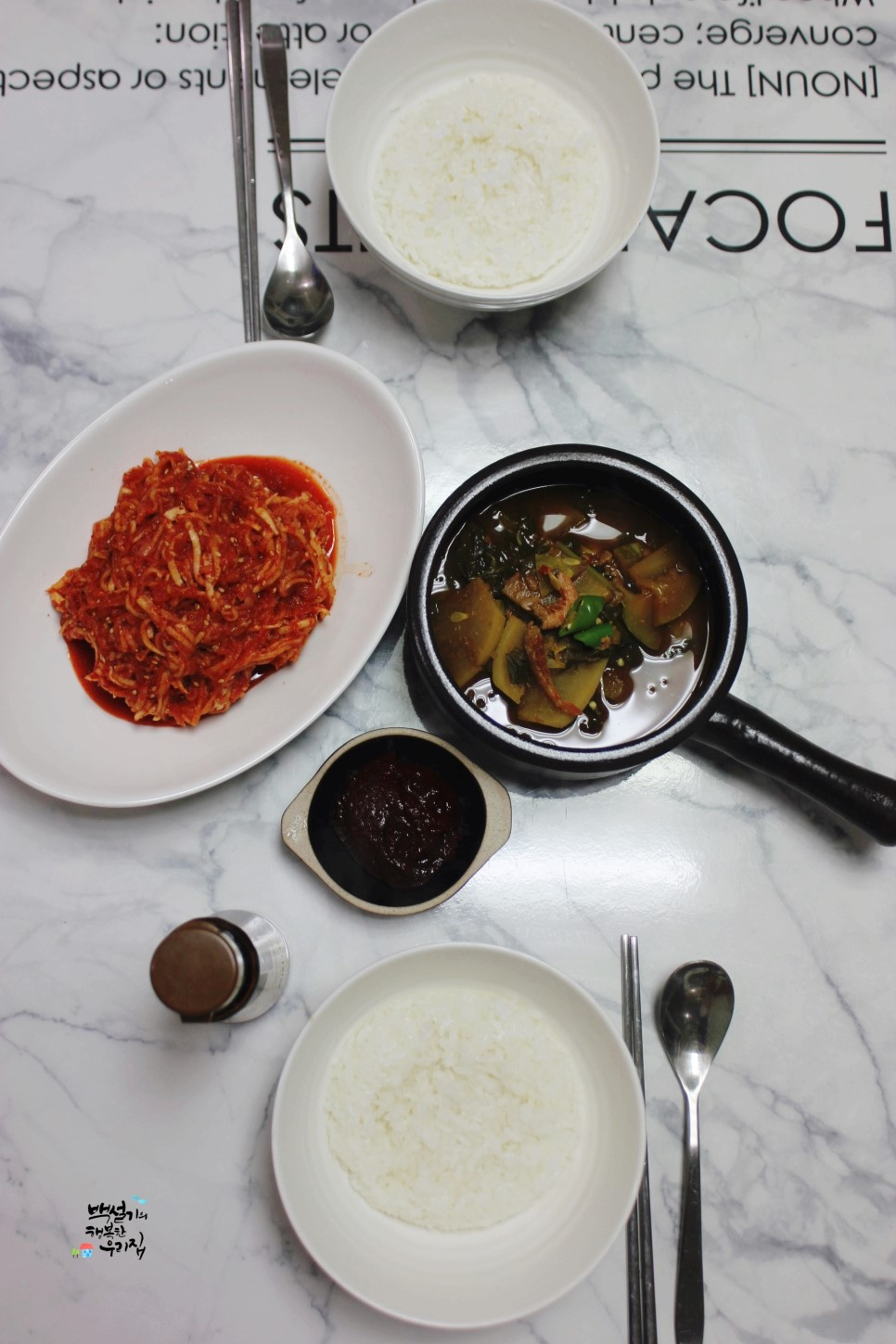 Preparé rápidamente el doenjang jjigae y la ensalada de rábano, y antes de darme cuenta, tenía una comida abundante lista sobre la mesa en unos 30 minutos.