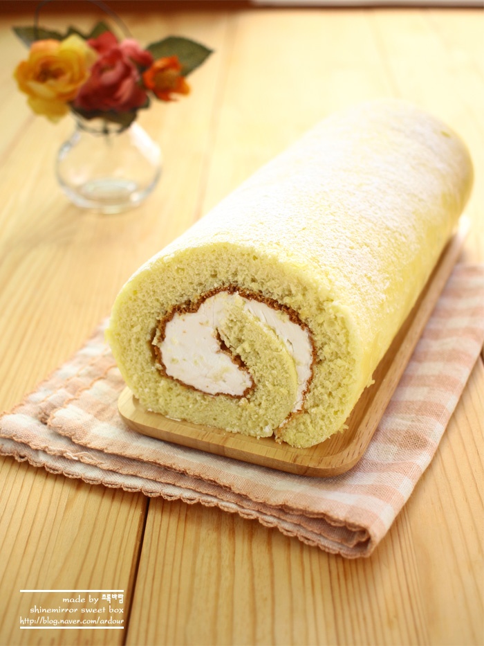 Retira con cuidado el bizcocho horneado del molde y despega el papel de horno. Deja que se enfríe ligeramente hasta que aún esté tibio al tacto. Coloca un paño de cocina húmedo sobre tu superficie de trabajo y pon el bizcocho, con la parte superior hacia arriba, sobre el paño. Para que enrollarlo sea más fácil, recorta los bordes del bizcocho en ángulo. Extiende el Relleno de Crema de Miel preparado uniformemente sobre el bizcocho. Comenzando desde un borde, enrolla suavemente el bizcocho, usando el paño para guiarlo, similar a enrollar un rollo de sushi (kimbap). Una vez enrollado, déjalo reposar en el refrigerador durante 1-2 horas para que fije su forma. Finalmente, córtalo en porciones deseadas, ¡y tu delicioso Bizcocho Enrollado de Miel estará completo!