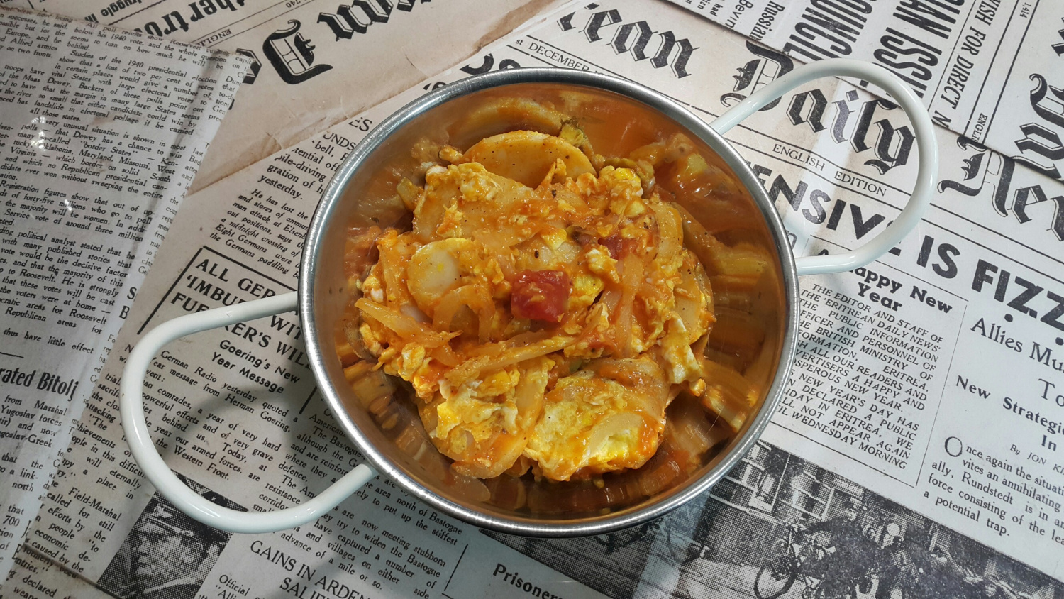 Cuando los pasteles de arroz estén parcialmente cocidos, vierte la mezcla de huevo preparada por los bordes de la sartén, dejando que fluya entre los tteok.