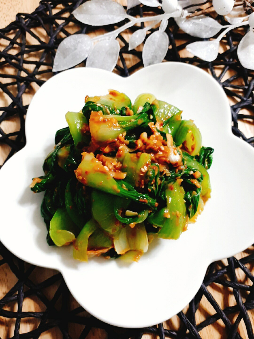 Coloca el bok choy escurrido en un bol. Añade todos los ingredientes del aderezo: doenjang, ajo picado, cebolleta picada, aceite de sésamo y semillas de sésamo tostadas.