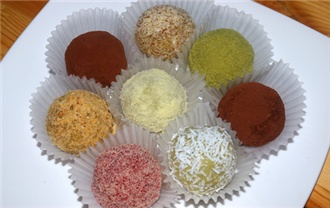 Mientras la cobertura de chocolate aún esté ligeramente blanda, haz rodar las bolitas cubiertas sobre los toppings elegidos. Puedes usar almendras fileteadas, cacahuetes triturados, crujientes migas de galleta, dulce coco rallado, sabrosas semillas de calabaza, suave polvo de soja tostada, fragante té verde en polvo o rico cacao en polvo; ¡mezcla y combina para obtener una variedad de sabores y texturas! Coloca las bolas terminadas sobre platos o bandejas cubiertos con papel de hornear. Refrigera durante unos 10 minutos hasta que la cobertura de chocolate se haya endurecido firmemente.