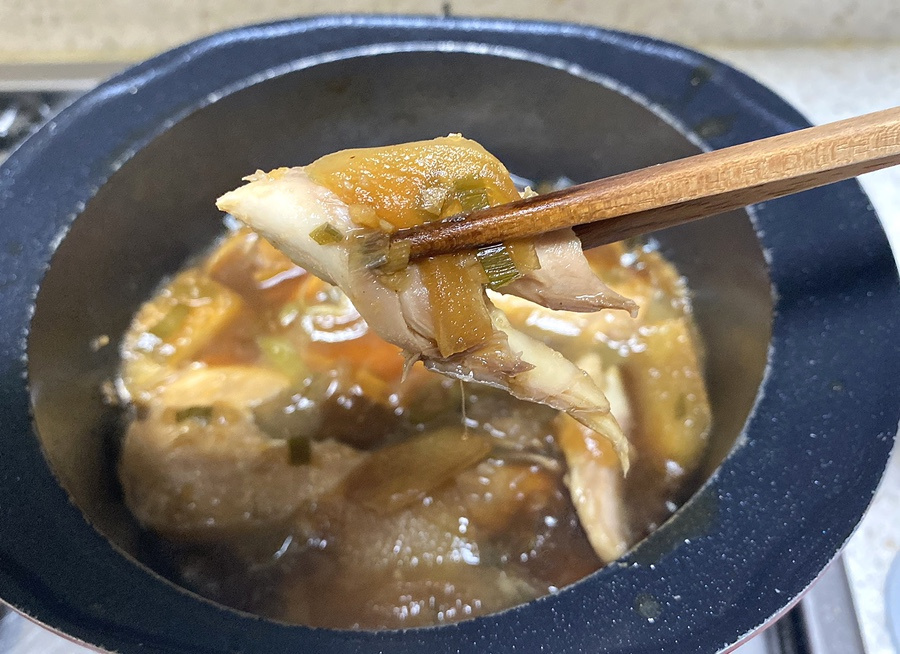 El plato estará listo cuando la caballa esté bien sazonada y el rábano esté lo suficientemente tierno como para pincharlo fácilmente con un palillo y se desmorone. Pruebe y ajuste el sazón si es necesario, agregando un poco más de salsa de soja si lo prefiere más salado.