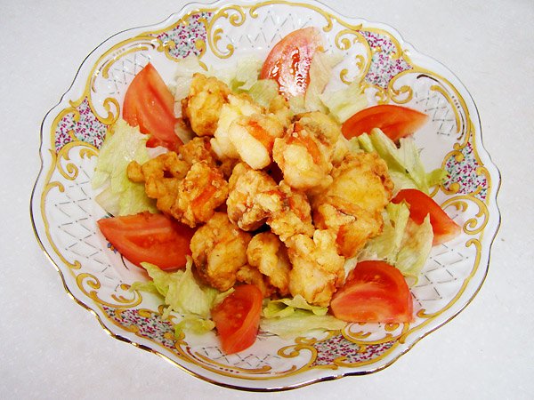 Lave la lechuga fresca y séquela. Coloque las hojas de lechuga de forma atractiva en un plato para servir. Añada unos gajos de tomate maduro para darle un toque de color, y luego coloque artísticamente los camarones crujientes fritos encima. Su hermosa bandeja está lista.