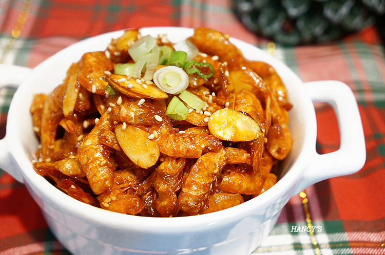 ¡Un platillo de acompañamiento verdaderamente sabroso que sabe exactamente a camarones Kan-Sho! Estamos preparando deliciosos camarones secos salteados con almendras en láminas añadidas para un toque crujiente y de nuez adicional. Este plato es una fantástica adición a tu repertorio de banchan (acompañamientos coreanos).