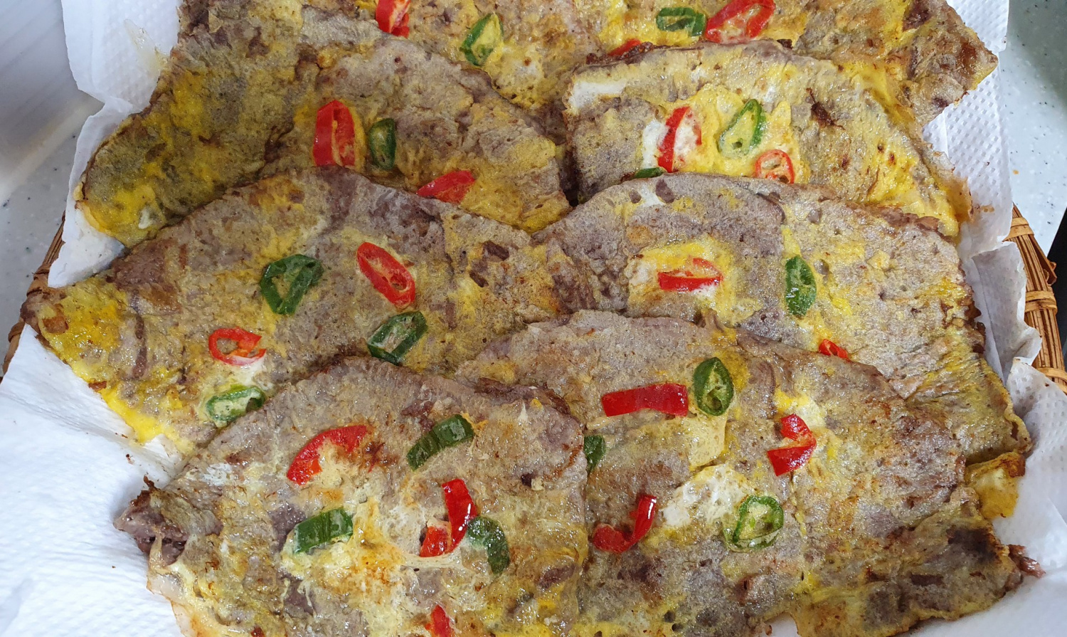 El Yukjeon de carne es bastante delgado, por lo que es crucial cocinarlo a fuego medio-bajo para evitar que se queme y lograr un color dorado-marrón en ambos lados. Para decorar, corta finamente los chiles rojos y verdes y colócalos de manera atractiva encima. La guarnición picante de chile corta la riqueza, haciendo que el Jeon sea aún más delicioso y visualmente atractivo.