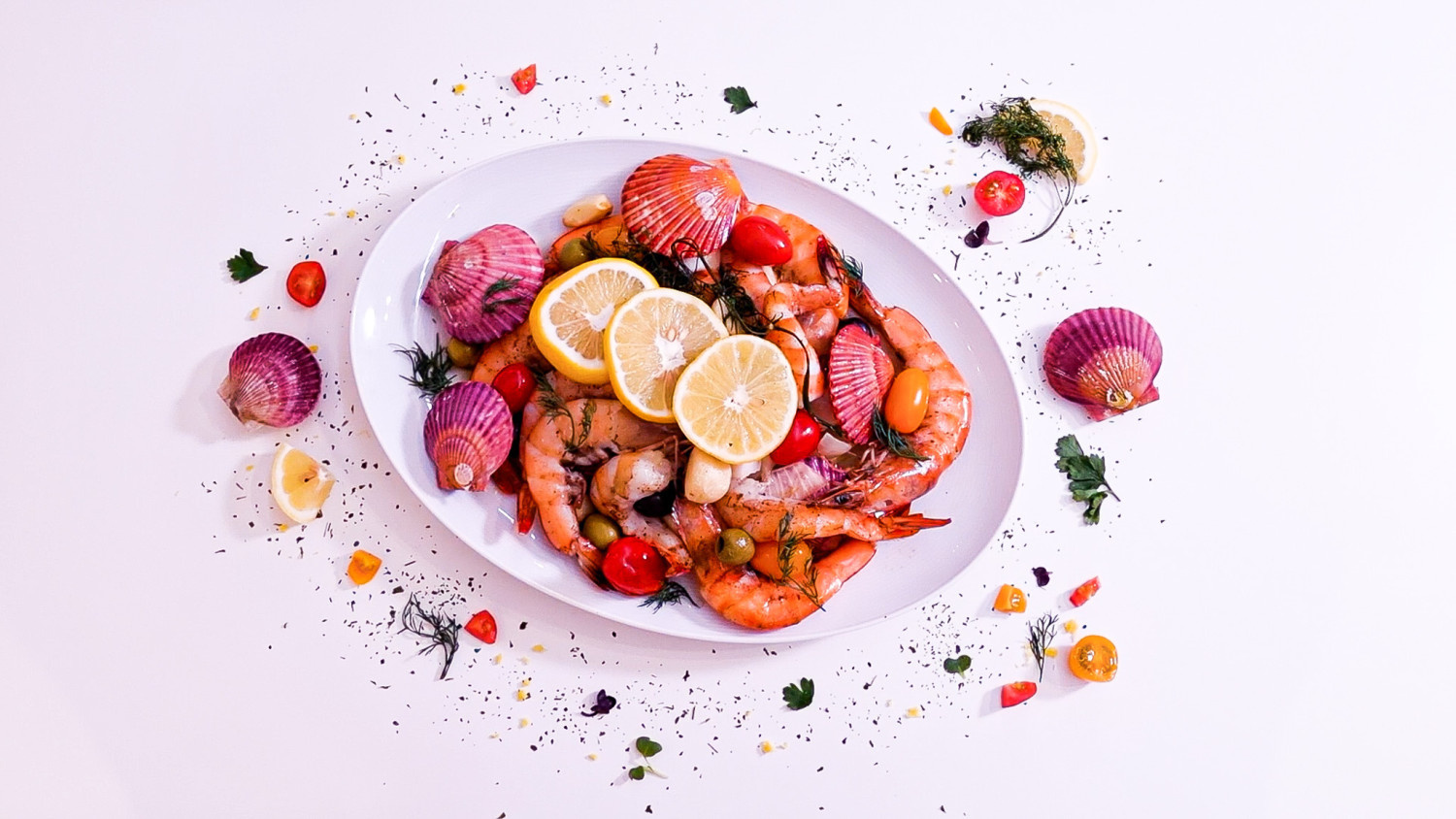Coloca la cebolla restante, 3 vieiras, los tomates cherry, las aceitunas verdes y las aceitunas negras alrededor de los camarones. Rocía nuevamente con abundante aceite de oliva.
