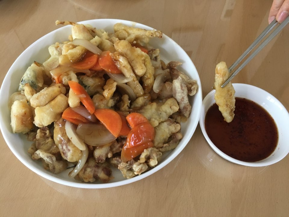 ¡Hora de hacer la salsa! En una cacerola, combine aproximadamente 3 vasos de agua (medida de vaso de papel), 8 cucharadas de azúcar, 6 cucharadas de vinagre, 2 cucharadas de salsa de ostras y 2 cucharadas de salsa de soja. Revuelva bien hasta que todo esté disuelto. Lleve la mezcla a ebullición. Una vez hirviendo, agregue las cebollas y zanahorias en rodajas y revuelva. Cuando las verduras comiencen a ablandarse, es hora de espesar la salsa. En un bol pequeño, mezcle 1 cucharadita de maicena con 1 cucharada de agua para crear una mezcla espesa. Vierta gradualmente esta mezcla en la salsa hirviendo mientras revuelve continuamente. Continúe revolviendo por un momento hasta que la salsa espese a su gusto, luego apague el fuego. (T se refiere a una cuchara sopera coreana y los vasos son vasos de papel estándar).
