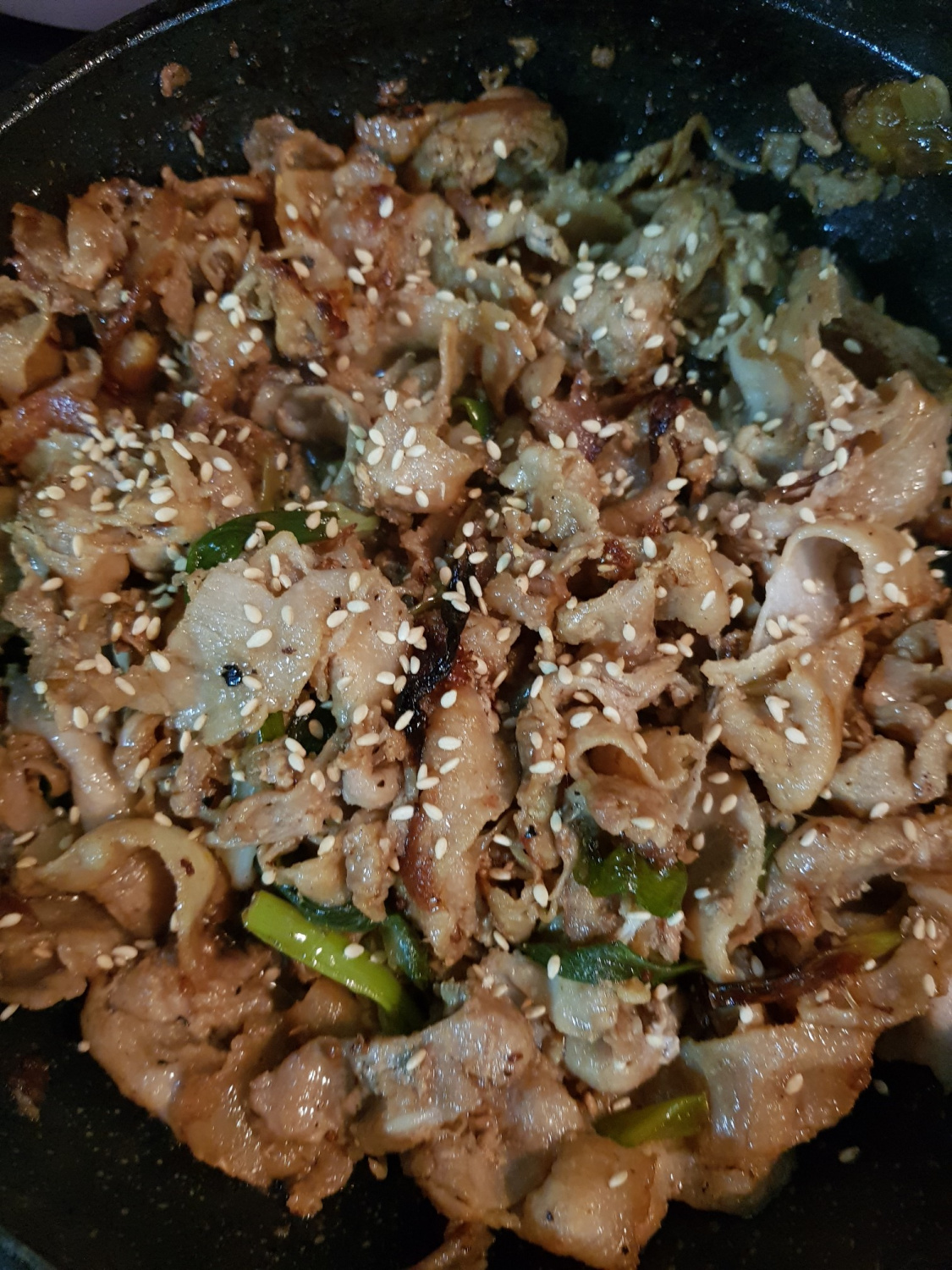 Finalmente, justo antes de apagar el fuego, espolvorea una pizca de semillas de sésamo tostadas sobre el plato para darle un sabor a nuez y un atractivo visual. Dale una última y rápida mezcla para combinar. ¡Tu deliciosa panceta de cerdo salteada está lista! Este plato es maravilloso servido sobre un bol de arroz caliente o disfrutado como un wrap en hojas de lechuga. ¡Buen provecho!