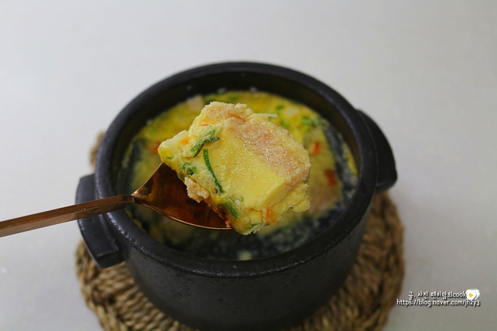 Vierte la mezcla de huevo preparada en un ‘ttukbaegi’ (olla de barro coreana). Usar un ‘ttukbaegi’ ayuda a distribuir el calor de manera uniforme, resultando en un chawanmushi húmedo y tierno.