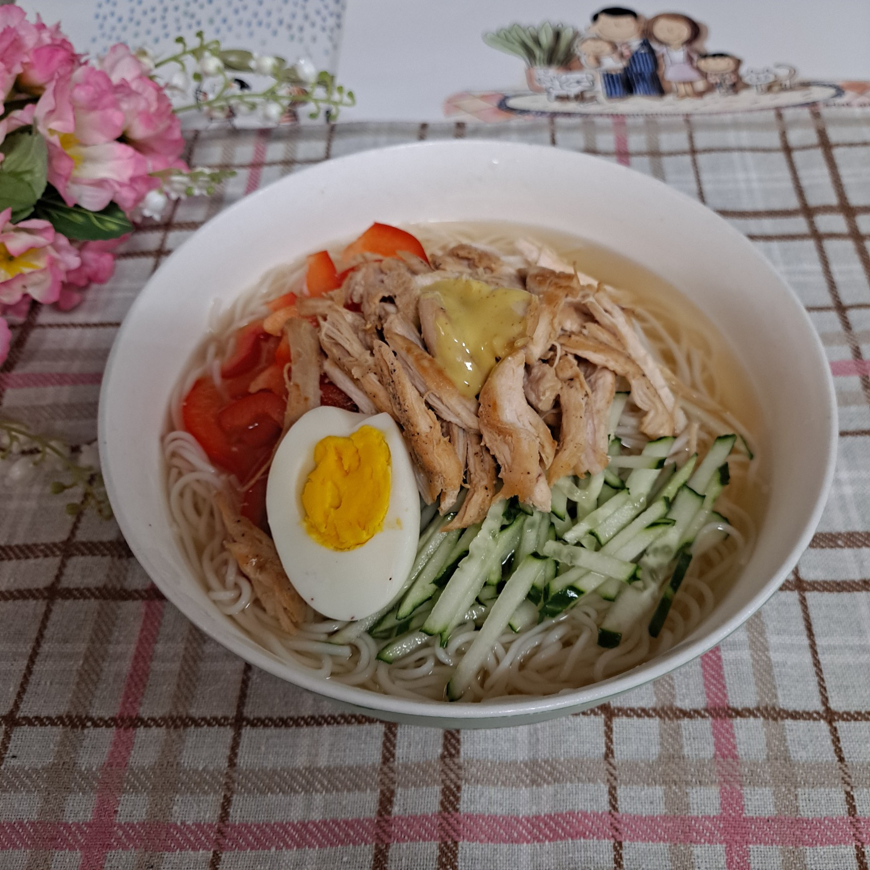 Coloca los fideos cocidos de forma atractiva en un bol para servir. Cubre con el pepino y el pimiento rojo cortados en juliana, la pechuga de pollo desmenuzada y el huevo duro cortado por la mitad. Finalmente, vierte generosamente el caldo frío y ligeramente congelado por encima. Para un toque extra de sabor picante, añade 1 cucharadita de mostaza a tu gusto.