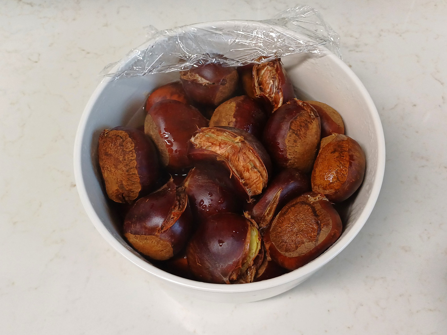 Primero, prepara las castañas. Lávalas bien para facilitar el pelado y luego déjalas en remojo en agua durante aproximadamente 1 hora. Esto asegurará que las castañas estén húmedas por dentro, haciendo que el proceso de cocción sea mucho más fácil.