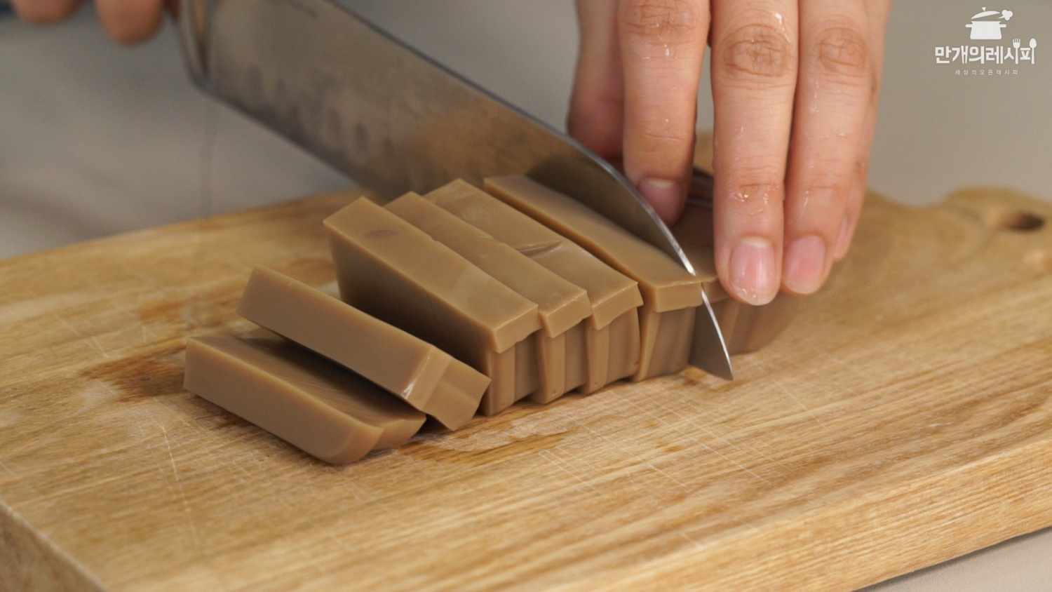 Si deseas conservar la gelatina de bellota por un período más largo o incorporarla en una preparación especial, considera hacer ‘gelatina de bellota deshidratada’. Primero, corta la gelatina que deseas conservar en porciones uniformes de aproximadamente 1 cm de grosor. Evita cortarla demasiado fina, ya que podría desmoronarse; mantener un grosor adecuado es clave.