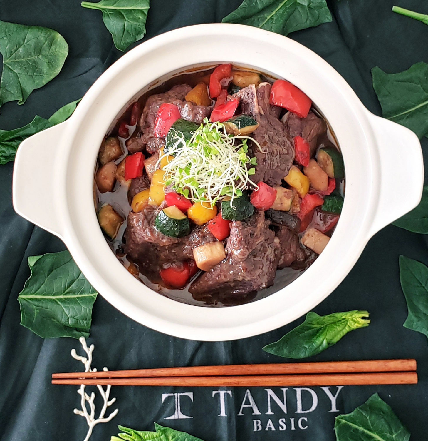 Después de 10 minutos, retira la tapa y reduce el fuego a bajo. Continúa estofando durante otros 10 minutos. Finalmente, destapa la sartén, añade las verduras salteadas de nuevo y baña las costillas con la salsa mientras cocinas a fuego bajo durante 3 minutos más, hasta que la salsa se haya espesado ligeramente y las costillas estén brillantes. Esto completa el plato.