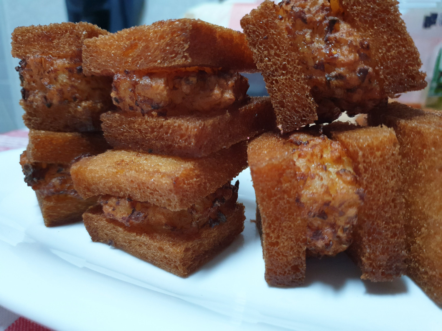 A continuación, preparemos el pan. Recorte cuidadosamente los bordes de cada rebanada de pan. Luego, corte cada rebanada por la mitad horizontalmente y luego nuevamente por la mitad, obteniendo 4 piezas iguales por rebanada. Extienda generosamente la mezcla de camarones preparada en el paso 1 sobre una pieza de pan. Cubra con otra pieza de pan para formar un sándwich. Presione suavemente con las manos o un cuchillo para asegurar que el relleno se adhiera bien.