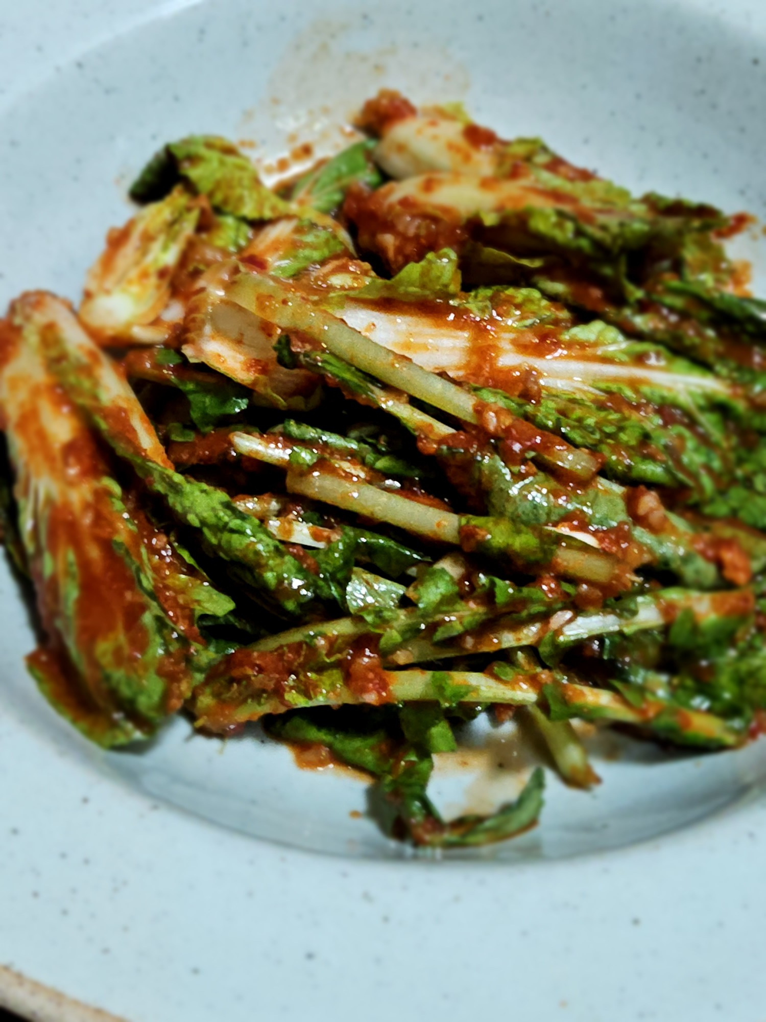 Este kimchi, hecho con rábano joven tierno y bok choy, es tan delicioso incluso sin salarlo previamente con sal marina gruesa. ¡Disfrutar de una cucharada de kimchi recién hecho sobre un tazón de arroz caliente es realmente delicioso! Si los trozos de kimchi son demasiado largos, puedes cortarlos en trozos del tamaño de un bocado con tijeras o un cuchillo para comerlos más fácilmente. ¡A tus hijos les encantará y dirán ‘¡El mejor kimchi de mamá!’ No dejes de probar a hacer este delicioso kimchi!