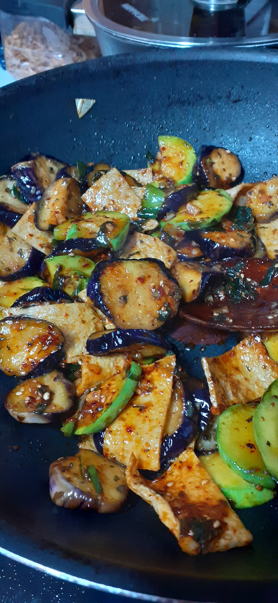 Finalmente, espolvorea una pizca de albahaca seca para darle un toque aromático. También puedes añadir una pizca de semillas de sésamo si lo deseas. Una vez que la salsa haya cubierto todo bien y el salteado tenga un acabado brillante, apaga el fuego y sirve. ¡La fragante albahaca complementará maravillosamente el sabor fresco de las verduras de verano!