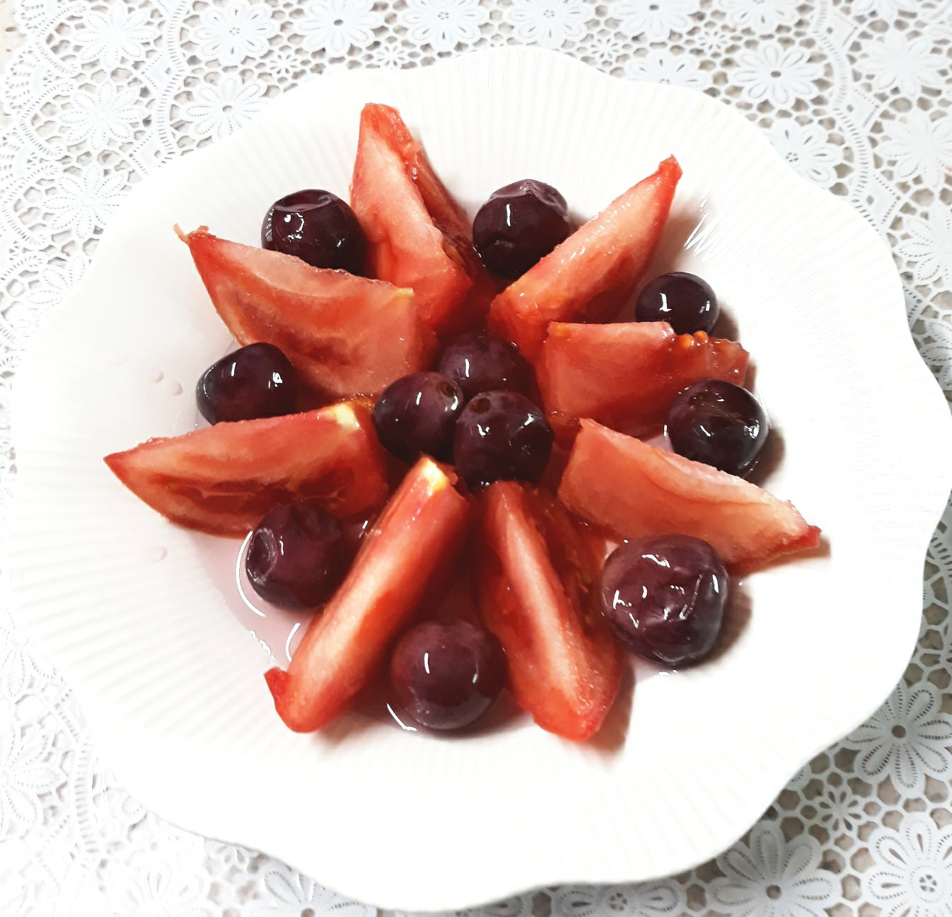 Disponga las uvas congeladas glaseadas con miel ya frías en un plato para servir. Añada los trozos de tomate cortados junto a las uvas. ¡Sus deliciosas uvas congeladas glaseadas con miel estarán listas para disfrutar!