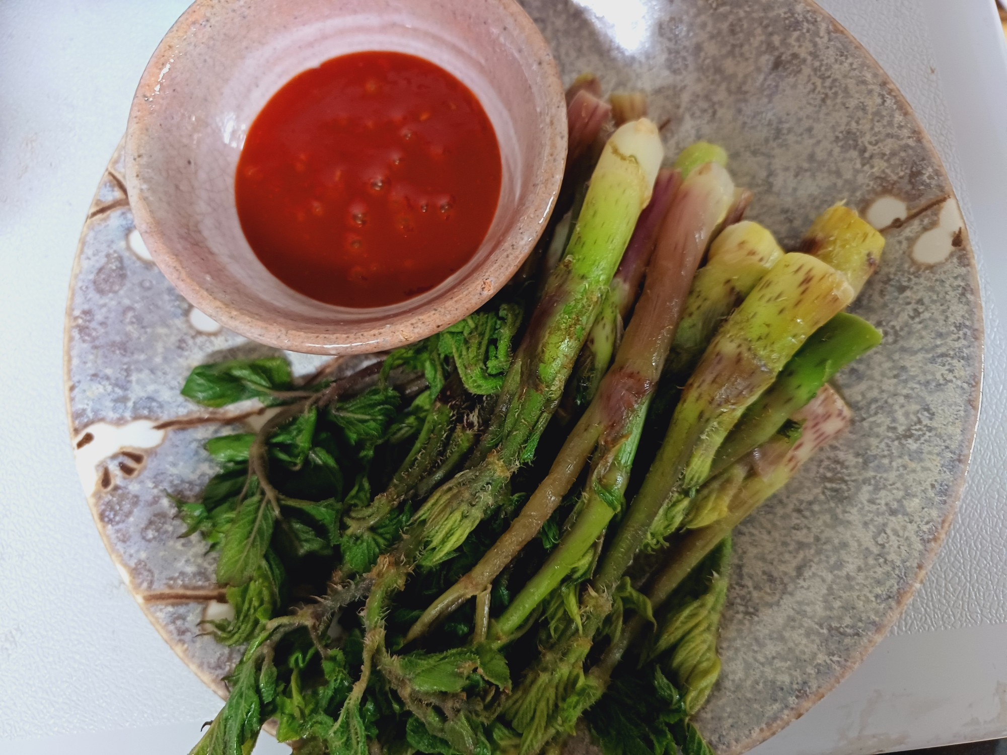 Coloca el Dureup escurrido de manera atractiva en un plato para servir. Sírvelo con un acompañamiento de ‘chojang’ (salsa picante de vinagre) para mojar, ¡y tu sencillo pero delicioso Dureup hervido estará listo! Es una forma maravillosamente fácil de disfrutar el sabor de la primavera.