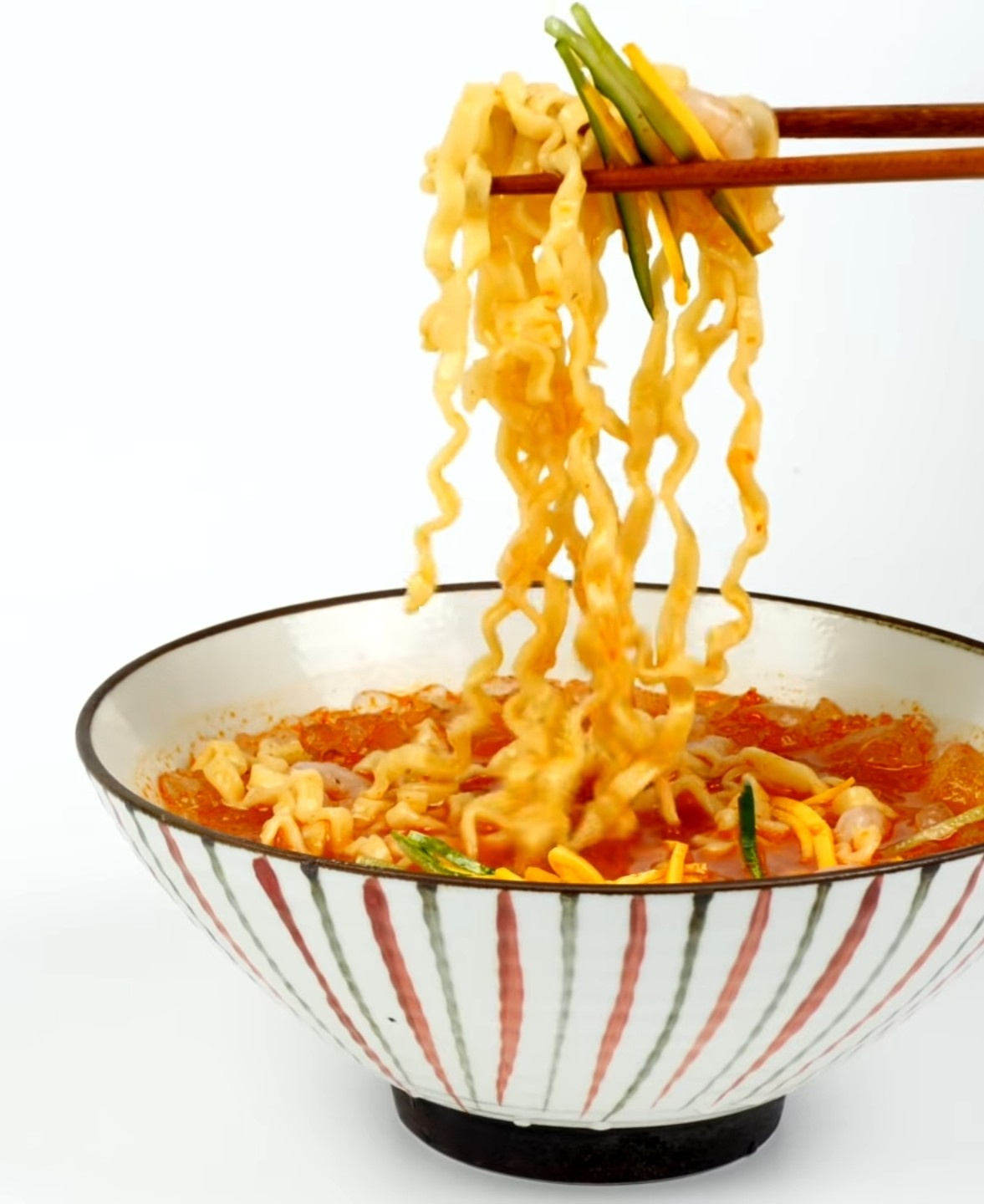 Coloca el caldo sazonado en el congelador por un corto tiempo para que se enfríe aún más. Mientras tanto, cocina los fideos de jjamppong en agua hirviendo. Es mejor cocinarlos unos 30 segundos a 1 minuto menos de lo que sugieren las instrucciones del paquete para obtener una textura perfectamente al dente. Tan pronto como estén cocidos, enjuaga los fideos a fondo bajo agua fría corriente para eliminar todo el calor y escúrrelos bien.