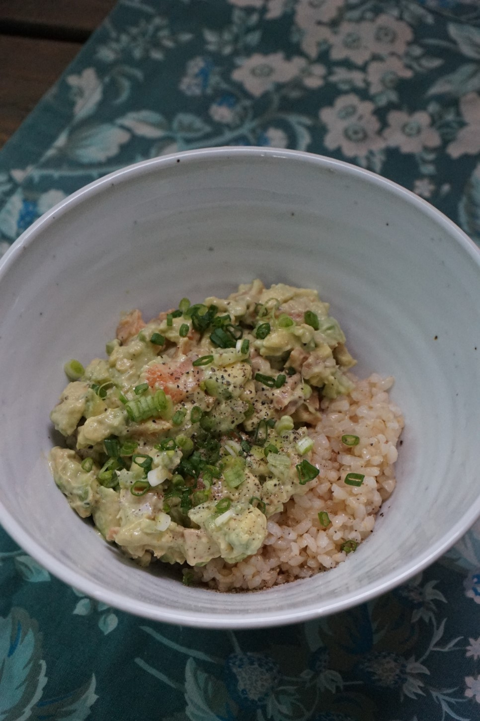 La textura cremosa del aguacate y el salmón con mayonesa a veces puede sentirse un poco rica. Para equilibrar esto, se añaden cebolletas finamente picadas como guarnición. Proporcionan un contraste fresco y agudo que contrarresta la riqueza y añade un agradable aroma. Si no tiene cebolletas, puede omitirlas o probar a usar cebollino finamente picado o incluso hojas de perilla finamente cortadas para un efecto similar.