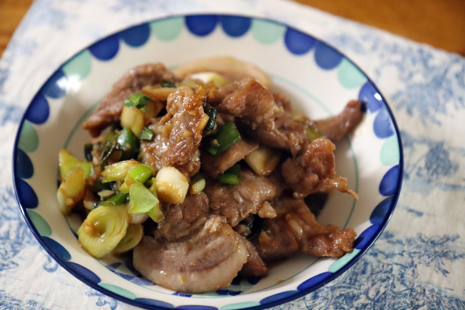 Una vez que la cebolleta esté fragante, añade todo el cerdo marinado a la sartén. Comienza sofriendo a fuego alto. Cuando la carne empiece a cocinarse y cambie de color, reduce el fuego a medio. Continúa removiendo y cocinando el cerdo, asegurándote de que esté bien cocido por dentro y con un brillo caramelizado. Cuando esté dorado y jugoso, retira del fuego para servir.