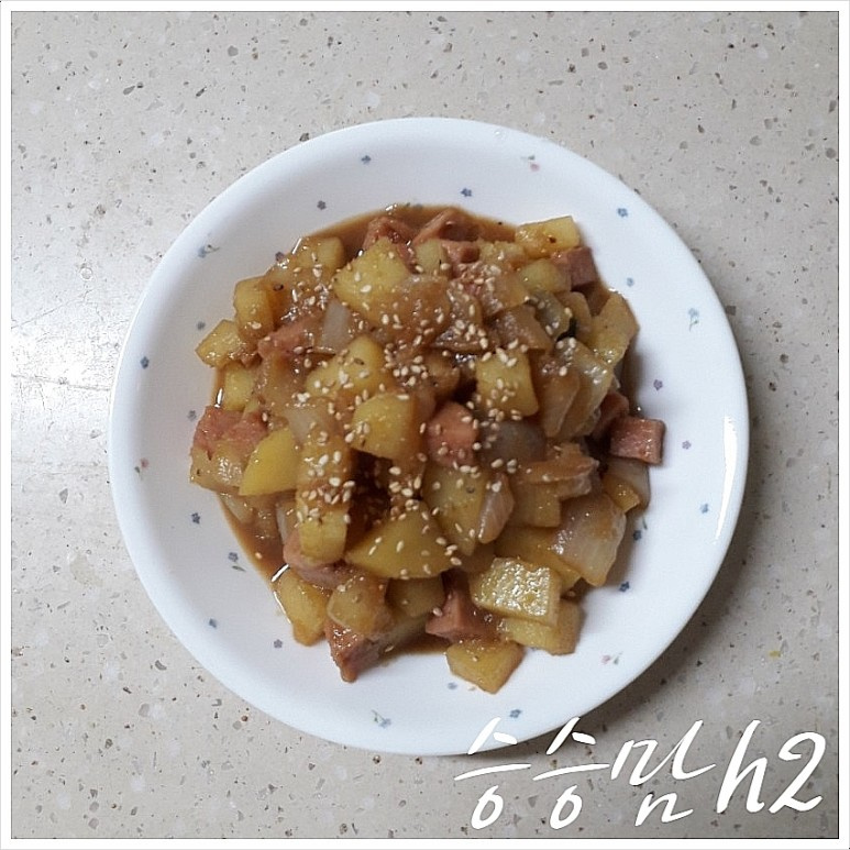 A medida que la salsa comience a ser absorbida por las patatas, añade el Spam cortado en cubos a la sartén y sofríe conjuntamente. El aceite y el sabor del Spam se mezclarán con las patatas, creando un sabor aún más rico. Ajusta la cantidad de salsa de soja teniendo en cuenta la salinidad del Spam.