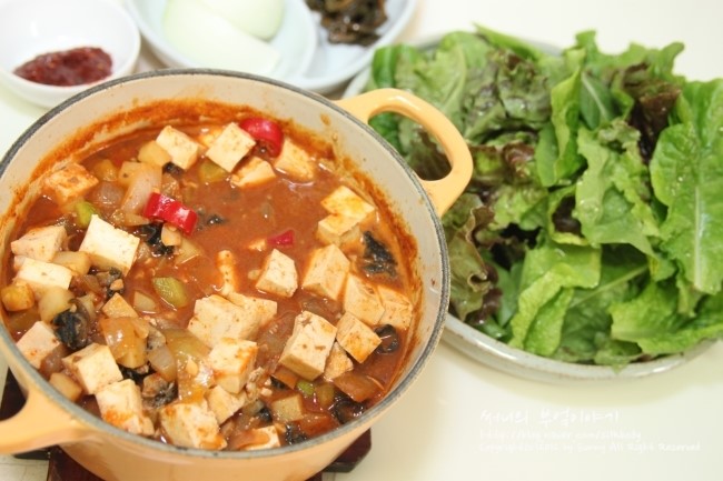 Una vez que las patatas estén casi cocidas, añada el tofu en cubos y los chiles rojos picados. Mézclelos suavemente para evitar que el tofu se rompa. Cocine a fuego lento un poco más hasta que todo esté bien caliente. ¡Su delicioso Gangdoenjang de Caracoles de Río está listo! Sírvalo generosamente sobre arroz caliente para una comida verdaderamente exquisita.