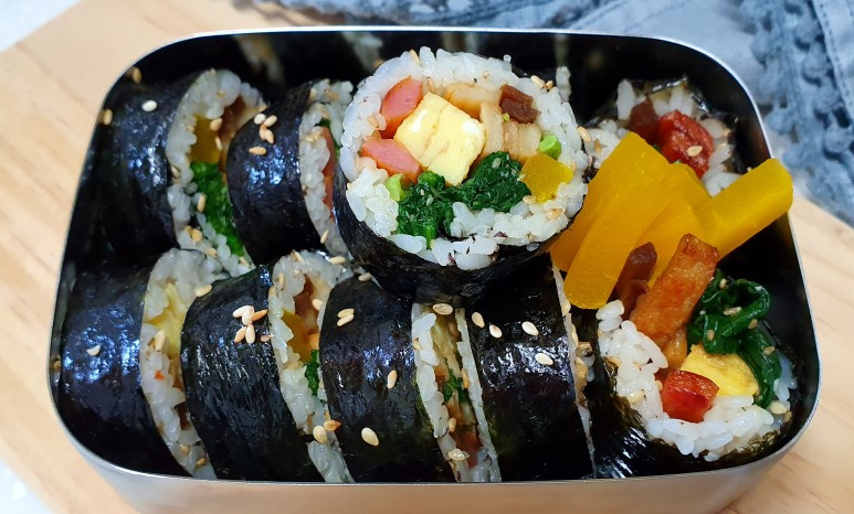Para los ingredientes base del gimbap, usa toallas de papel para secar completamente el rábano encurtido (Danmuji) y la raíz de bardana guisada (Ueong-jorim). Eliminar el exceso de humedad es clave para evitar un gimbap blando.