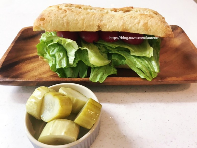 Voy a disfrutar de este delicioso sándwich de ciabatta con unos pepinillos de pepino caseros que preparé. ¡Los pepinillos agridulces serán un acompañamiento maravilloso!