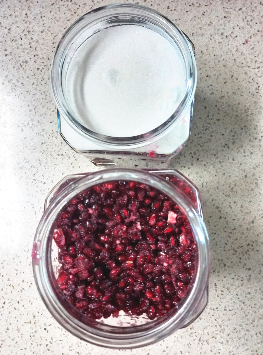 Ahora, mezclaremos las semillas con azúcar. Añade aproximadamente la mitad del azúcar total a las semillas de granada separadas. Remueve suavemente, con cuidado de no aplastar las semillas. Mezcla solo lo suficiente para que las semillas y el azúcar se combinen.