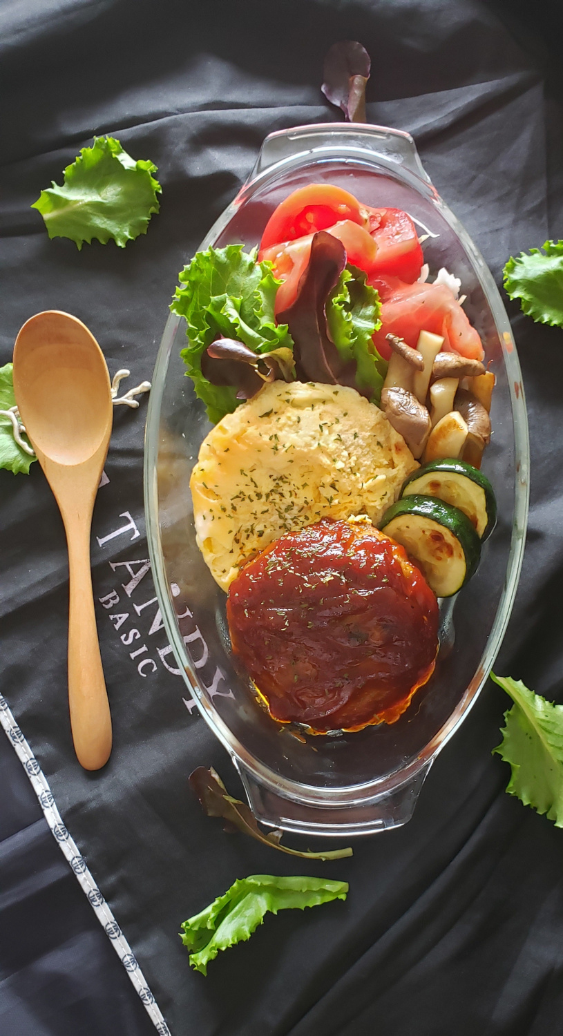Ahora es el momento de emplatar tu Loco Moco de forma hermosa. Comienza con una base de arroz, luego agrega una capa de lechugas frescas. A continuación, invierte con cuidado el huevo al vapor en el plato para una buena presentación. Coloca la hamburguesa de carne cubierta de salsa encima. Finalmente, dispón de forma atractiva el calabacín cocido, el champiñón ostra y el tomate, y espolvorea perejil seco para un final delicioso. ¡Tu Loco Moco está completo!