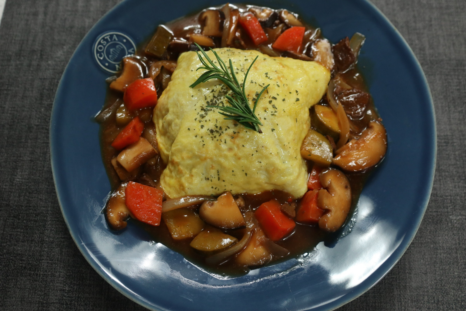 Finalmente, sirve generosamente la cálida y deliciosa salsa Hayashi sobre el arroz y la tortilla. ¡Tu elegante Arroz Hayashi casero está listo! ¡Disfruta de tu comida!