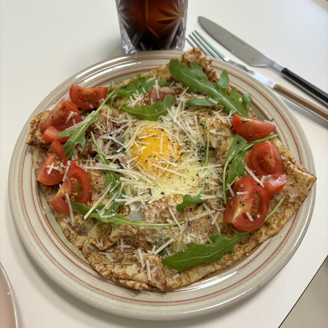 Una vez que la clara del huevo esté firme y la base de la crepa esté dorada y ligeramente crujiente, desliza con cuidado la galette sobre un plato de servir.