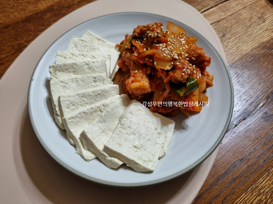 Coloca el tofu preparado cuidadosamente en un plato para servir. Sirve el delicioso cerdo salteado con kimchi al lado del tofu. Tu abundante y elegante Tofu Kimchi y plato salteado está ahora completo. ¡Disfruta con un tazón de arroz caliente!