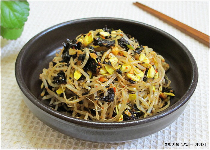 Hoy, prepararemos un delicioso acompañamiento utilizando brotes de soja, ricos en asparagina, y Gim (alga marina coreana tradicional), abundante en vitaminas. Les presentamos ‘Kongnamul Gim Muchim’ (Ensalada de Brotes de Soja y Alga Marina), un plato sencillo pero sabroso. Está repleto de nutrientes y ofrece una textura deliciosa, lo que lo convierte en el acompañamiento perfecto para cualquier comida. La asparagina en los brotes de soja también es conocida por ayudar a aliviar la fatiga y la resaca. ¡Vamos a enriquecer su mesa con este Kongnamul Gim Muchim brillante y sabroso!