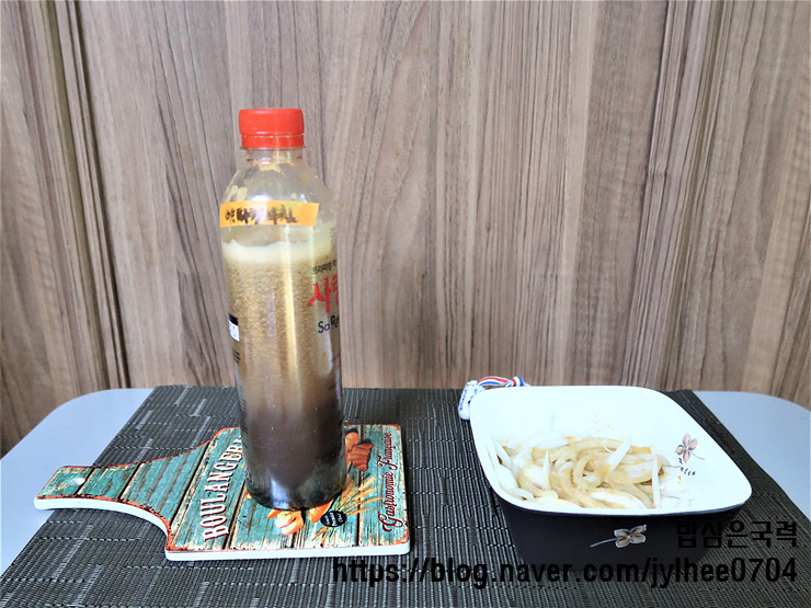 Ahora, es el momento de preparar el delicioso aderezo todoterreno. Si bien usar una báscula para mediciones precisas es lo ideal, usar un vaso de chupito de soju (aproximadamente 50 ml), comúnmente encontrado en los hogares coreanos, facilita la medición. Usar un vaso de soju de papel asegura una medición más limpia.