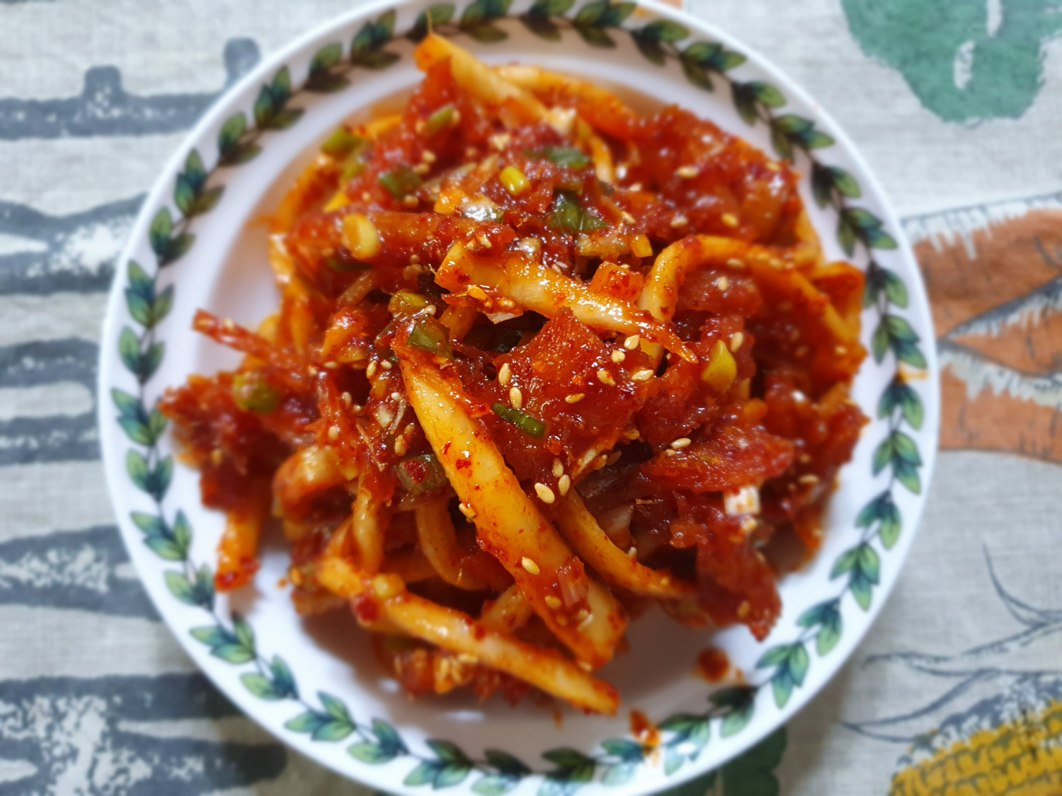 En lugar del típico caldo de pollack, ¡prueba a preparar una deliciosa ensalada sazonada con pollack seco y raíz de flor de globo! Es un acompañamiento maravillosamente apetitoso, perfecto para cualquier comida.