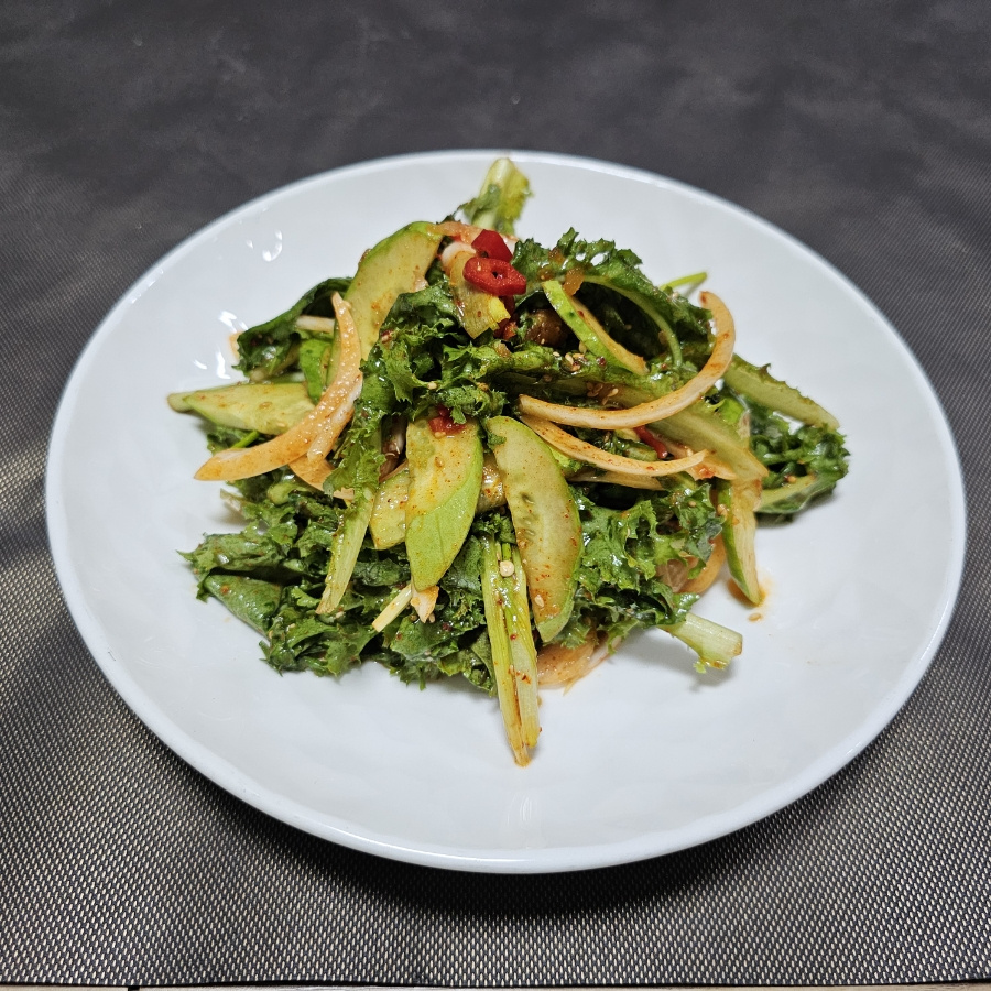 Las notas ligeramente amargas de la achicoria la convierten en un excelente acompañamiento para el arroz, y sus ricos nutrientes la hacen una opción de ensalada saludable por sí sola. Sin embargo, después de probar esta deliciosa ensalada, ¡el antojo de carne se vuelve irresistible! Así que, asé un poco de panceta de cerdo hasta que estuviera maravillosamente crujiente. Coloca una porción generosa de la ensalada de achicoria y pepino sobre un trozo de panceta crujiente y da un gran bocado. La combinación de las verduras crujientes y la sabrosa panceta es absolutamente espectacular. Ofrece un encanto único que supera incluso a los acompañamientos tradicionales a base de kimchi como el ‘pajori’ (ensalada de cebolleta) o los rollitos de lechuga, ¡trayendo inmensa felicidad a tu mesa. ¡Tienes que probar a prepararlo!