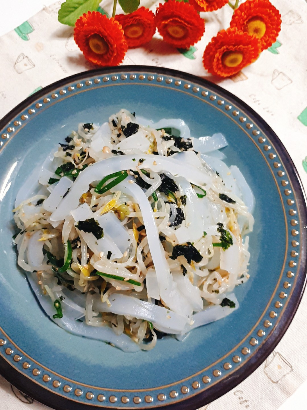 Descubra una ensalada refrescante y sencilla, elaborada con gelatina de frijol verde (cheongpomuk) y brotes de soja crujientes. Este plato es perfecto para una comida ligera o como acompañamiento dietético, ofreciendo un sabor delicado pero muy satisfactorio.