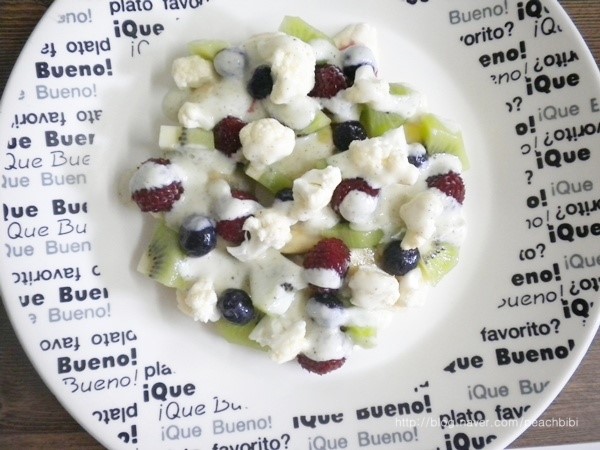 Disponga los ingredientes preparados de la ensalada de forma atractiva en un plato de servir o un bol. Coloque artísticamente las frutas y la coliflor, mostrando sus colores, para una presentación aún más apetitosa.