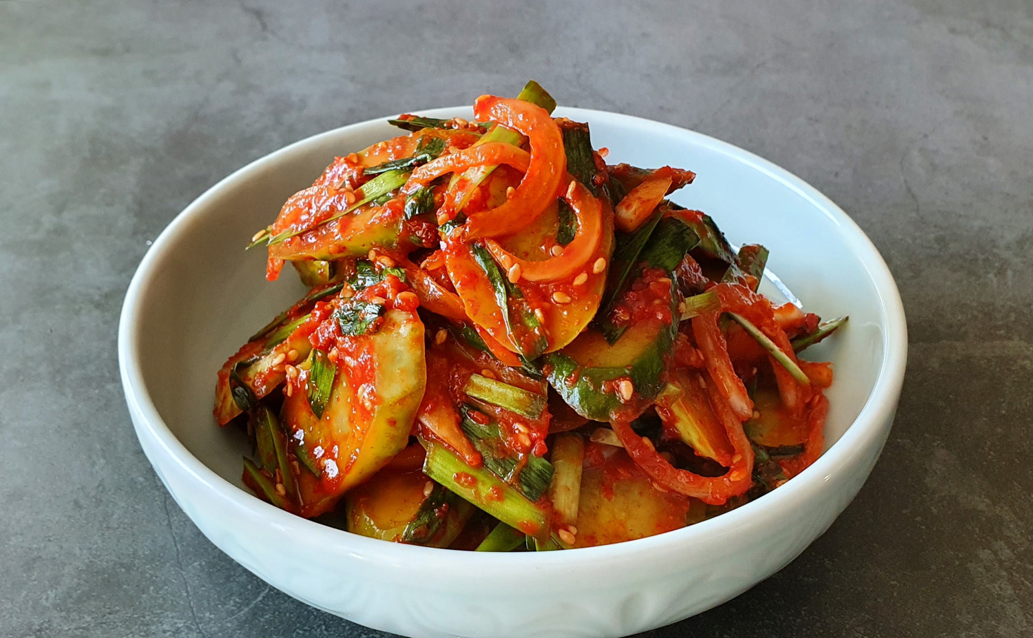 Pasados 20 minutos, enjuaga ligeramente los pepinos escalfados bajo agua fría y exprime el exceso de humedad. Escurrir bien los pepinos es clave para evitar que el aderezo quede aguado. En un bol, combina los pepinos escurridos con la cebolla en juliana, 1 cucharadita de ajo picado y 2 cucharadas de gochugaru. Mezcla suavemente todo, asegurándote de que los condimentos cubran bien los ingredientes.