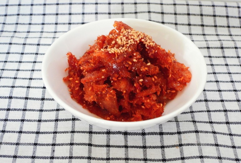 Esta es una ensalada maravillosamente tierna y húmeda hecha de pescado monje seco desmenuzado. Añadir un trozo de mantequilla realza su sabor salado, llevando el gusto a otro nivel. Es perfecta como guarnición para el arroz o incluso como un delicioso aperitivo para los niños. ¡Disfruta de esta golosina especial!