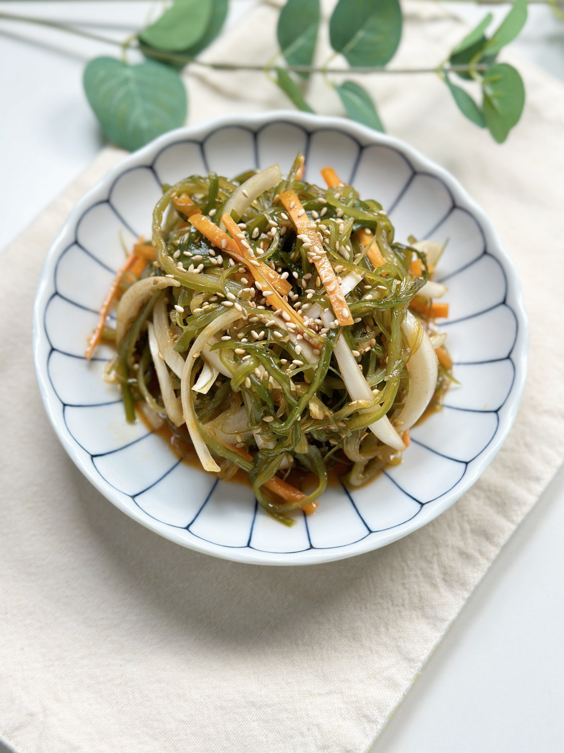 Hoy, les presentamos el ‘Miyeokjulgi Cho Muchim’, una refrescante ensalada de tallos de algas marinas (miyeokjulgi) aderezada con una salsa agridulce, ¡en lugar de saltearlos! Las algas marinas saludables combinan maravillosamente con aderezos vibrantes. La textura única y ligeramente crujiente de los tallos de algas, junto con la frescura de la cebolla y la zanahoria, y una sabrosa salsa de vinagreta, crean una armonía perfecta. ¡Este plato es un acompañamiento delicioso que ofrece un cambio refrescante de lo habitual! ¡Empecemos a prepararlo!